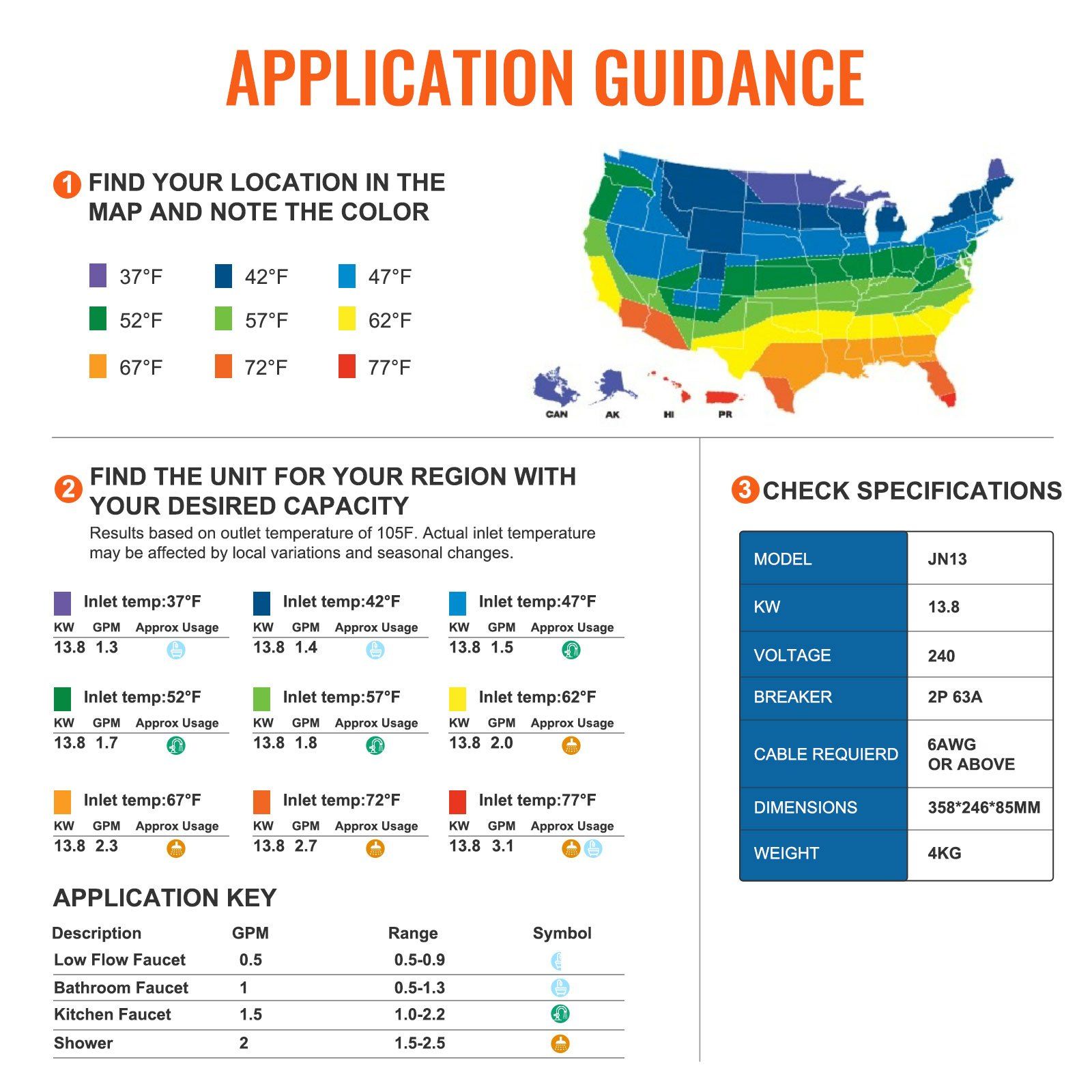 5.Know about Installation: Wall-mount design maximizes your living or working space. Our compact electric water heater comes with NPT 1/2'' water inlet and outlet. Please note that 1 x 70A circuit breakers and a 6 AWG power cables are required for installation, and we recommend seeking professional assistance.